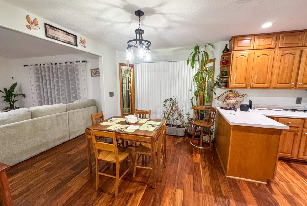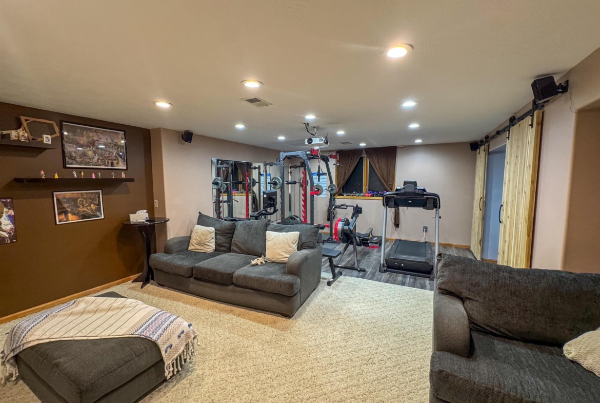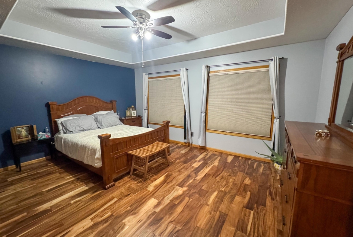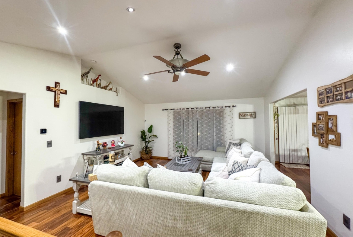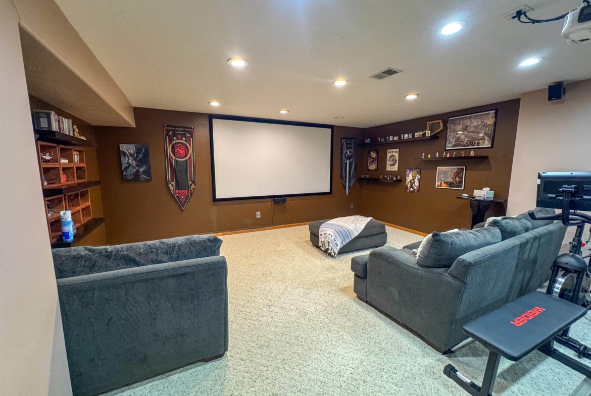 Beautifully maintained 4-bedroom, 3-bath ranch offering a thoughtful layout and quality upgrades throughout. The welcoming wide foyer opens into a bright living room with vaulted ceilings, large windows, and rich acacia hardwood floors that flow through the main living areas. The open yet well-defined floor plan provides excellent sightlines between the living room and eat-in kitchen. The kitchen features custom cabinetry, generous counter and cabinet space, a corner sink overlooking the backyard, and a slider leading to the deck. Step outside to enjoy the beautifully crafted deck with custom pergola and built-in seating — perfect for entertaining or relaxing. The main level includes three spacious bedrooms, a full bathroom with luxury vinyl plank flooring, and a private primary suite. The primary bedroom features a wall of windows, walk-in closet, and ensuite bath with double vanity, jacuzzi tub, and separate shower. The lower level is finished with exceptional use of space, offering a large family room with wet bar, a dedicated theater room ideal for movie nights, a full bathroom, craft room, office area, and a fourth bedroom with walk-in closet. Additional highlights include a WiFi-enabled sprinkler system, oversized heated and insulated garage, and a large side parking area with RV parking and 50-amp hookup. A home that truly offers space, comfort, and functionality inside and out.