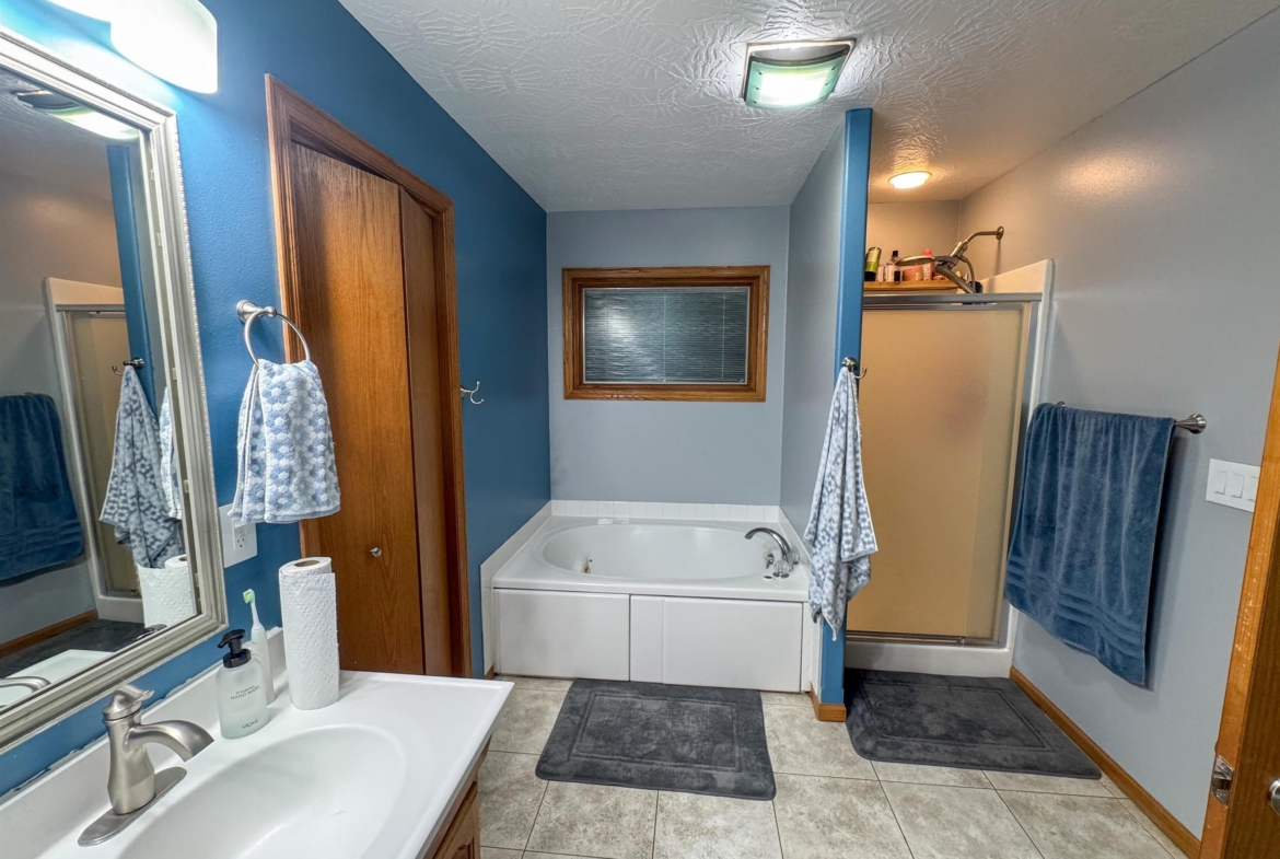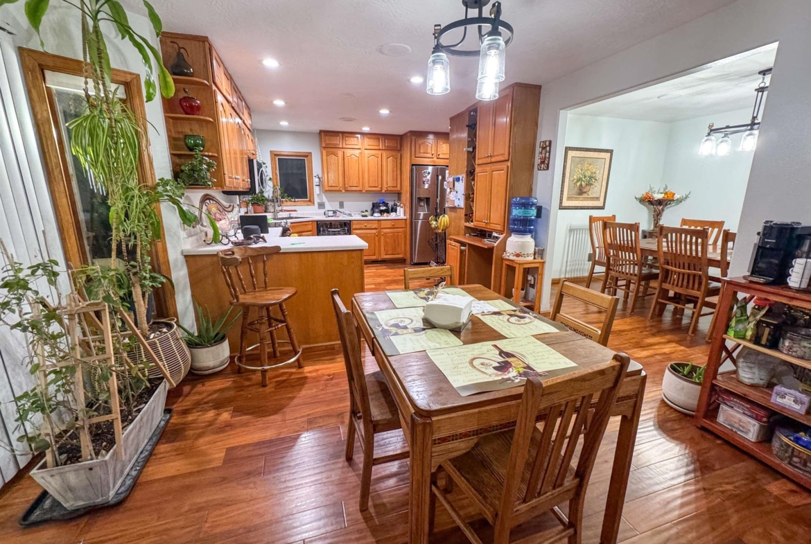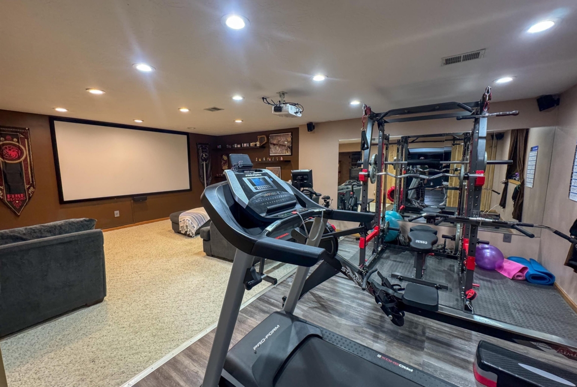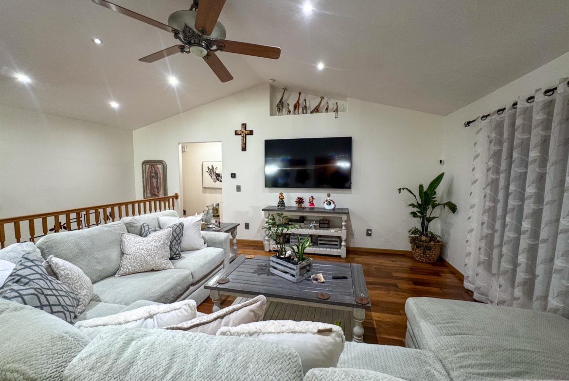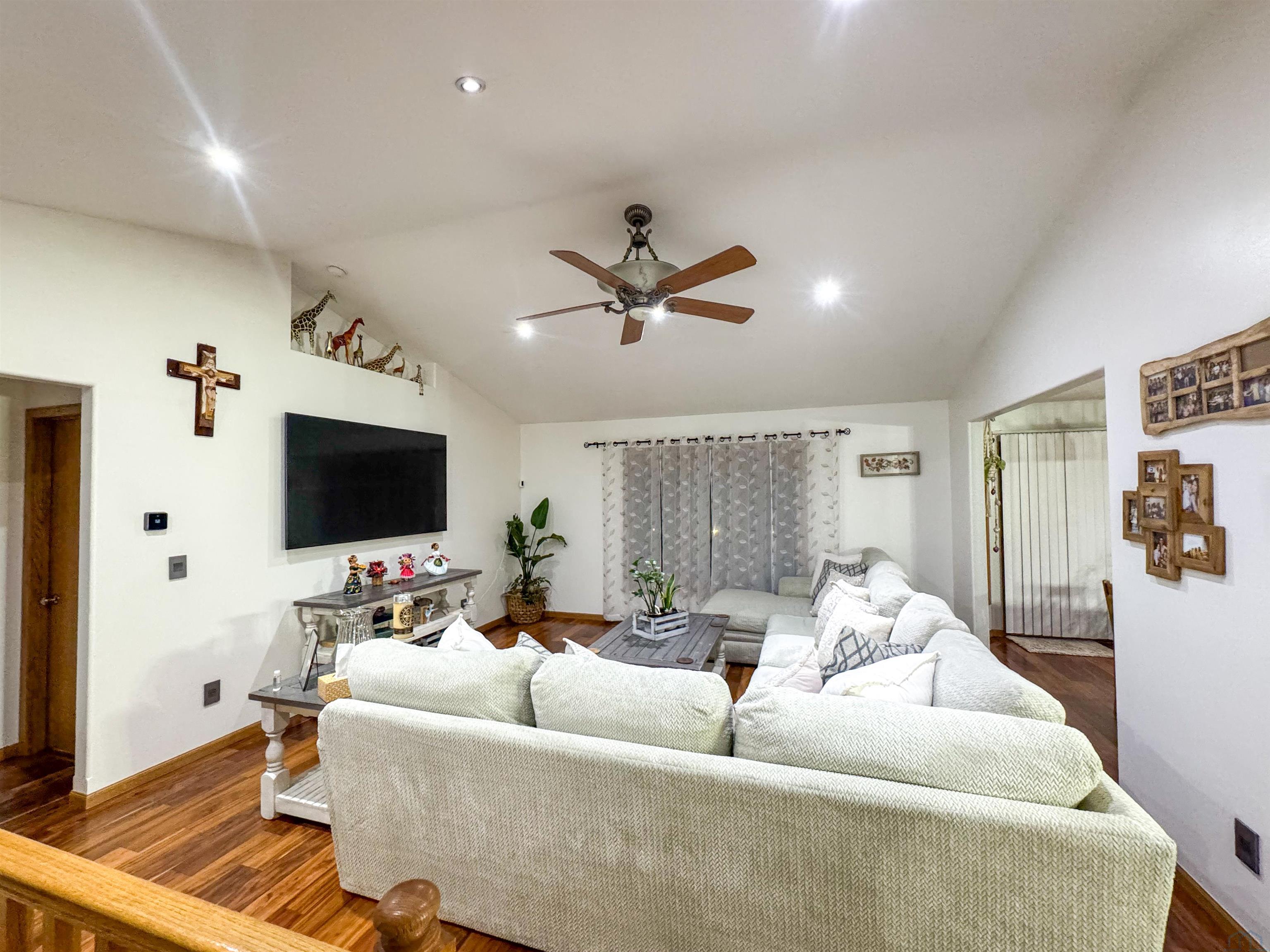 Beautifully maintained 4-bedroom, 3-bath ranch offering a thoughtful layout and quality upgrades throughout. The welcoming wide foyer opens into a bright living room with vaulted ceilings, large windows, and rich acacia hardwood floors that flow through the main living areas. The open yet well-defined floor plan provides excellent sightlines between the living room and eat-in kitchen. The kitchen features custom cabinetry, generous counter and cabinet space, a corner sink overlooking the backyard, and a slider leading to the deck. Step outside to enjoy the beautifully crafted deck with custom pergola and built-in seating — perfect for entertaining or relaxing. The main level includes three spacious bedrooms, a full bathroom with luxury vinyl plank flooring, and a private primary suite. The primary bedroom features a wall of windows, walk-in closet, and ensuite bath with double vanity, jacuzzi tub, and separate shower. The lower level is finished with exceptional use of space, offering a large family room with wet bar, a dedicated theater room ideal for movie nights, a full bathroom, craft room, office area, and a fourth bedroom with walk-in closet. Additional highlights include a WiFi-enabled sprinkler system, oversized heated and insulated garage, and a large side parking area with RV parking and 50-amp hookup. A home that truly offers space, comfort, and functionality inside and out.