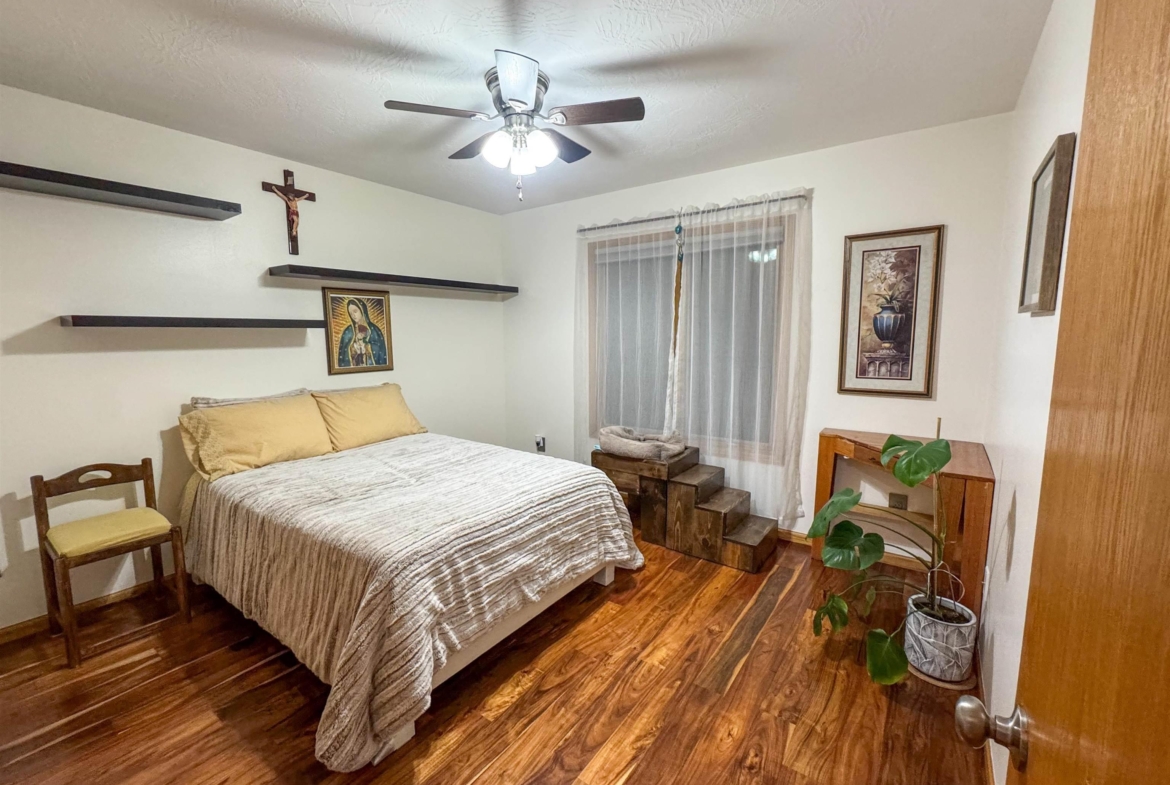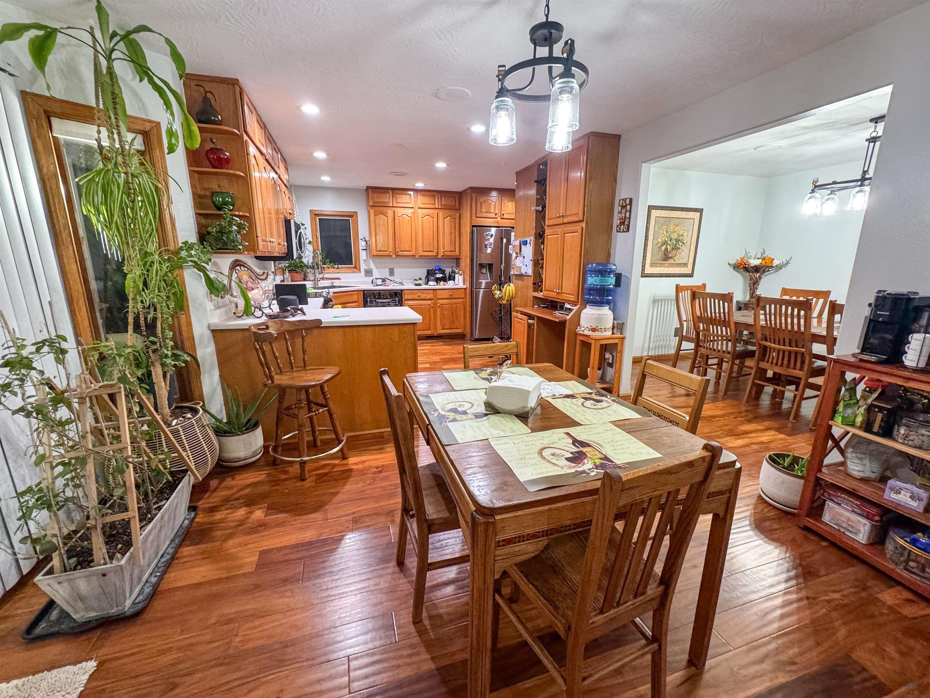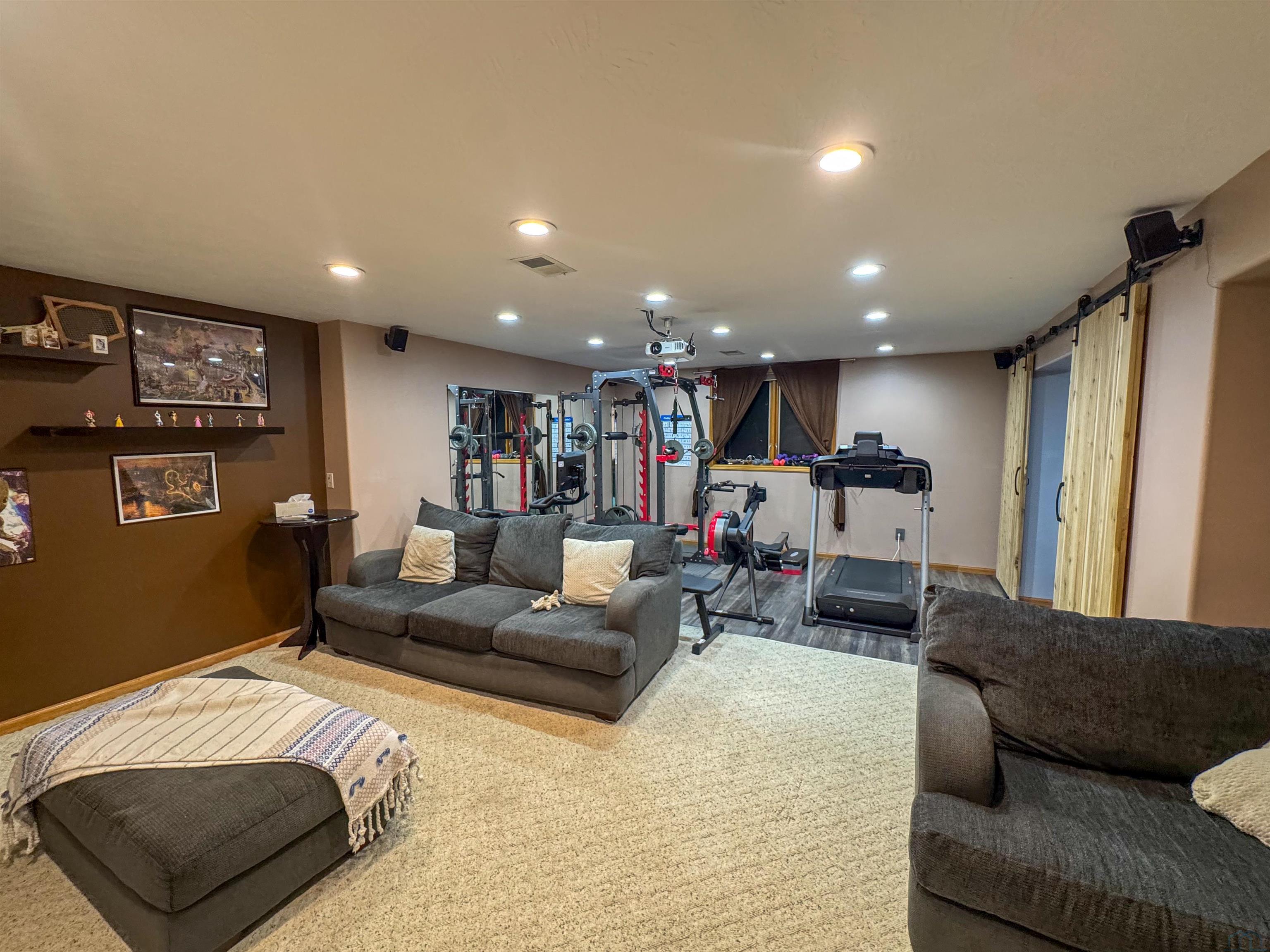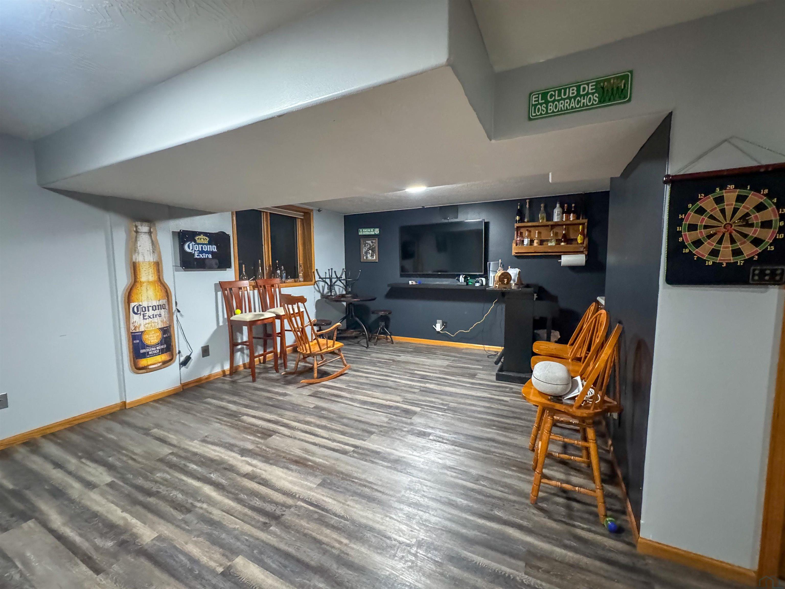 Beautifully maintained 4-bedroom, 3-bath ranch offering a thoughtful layout and quality upgrades throughout. The welcoming wide foyer opens into a bright living room with vaulted ceilings, large windows, and rich acacia hardwood floors that flow through the main living areas. The open yet well-defined floor plan provides excellent sightlines between the living room and eat-in kitchen. The kitchen features custom cabinetry, generous counter and cabinet space, a corner sink overlooking the backyard, and a slider leading to the deck. Step outside to enjoy the beautifully crafted deck with custom pergola and built-in seating — perfect for entertaining or relaxing. The main level includes three spacious bedrooms, a full bathroom with luxury vinyl plank flooring, and a private primary suite. The primary bedroom features a wall of windows, walk-in closet, and ensuite bath with double vanity, jacuzzi tub, and separate shower. The lower level is finished with exceptional use of space, offering a large family room with wet bar, a dedicated theater room ideal for movie nights, a full bathroom, craft room, office area, and a fourth bedroom with walk-in closet. Additional highlights include a WiFi-enabled sprinkler system, oversized heated and insulated garage, and a large side parking area with RV parking and 50-amp hookup. A home that truly offers space, comfort, and functionality inside and out.