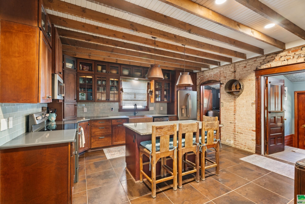 KitchenMain16x17Newer cabinets, wood floor, island, pantry