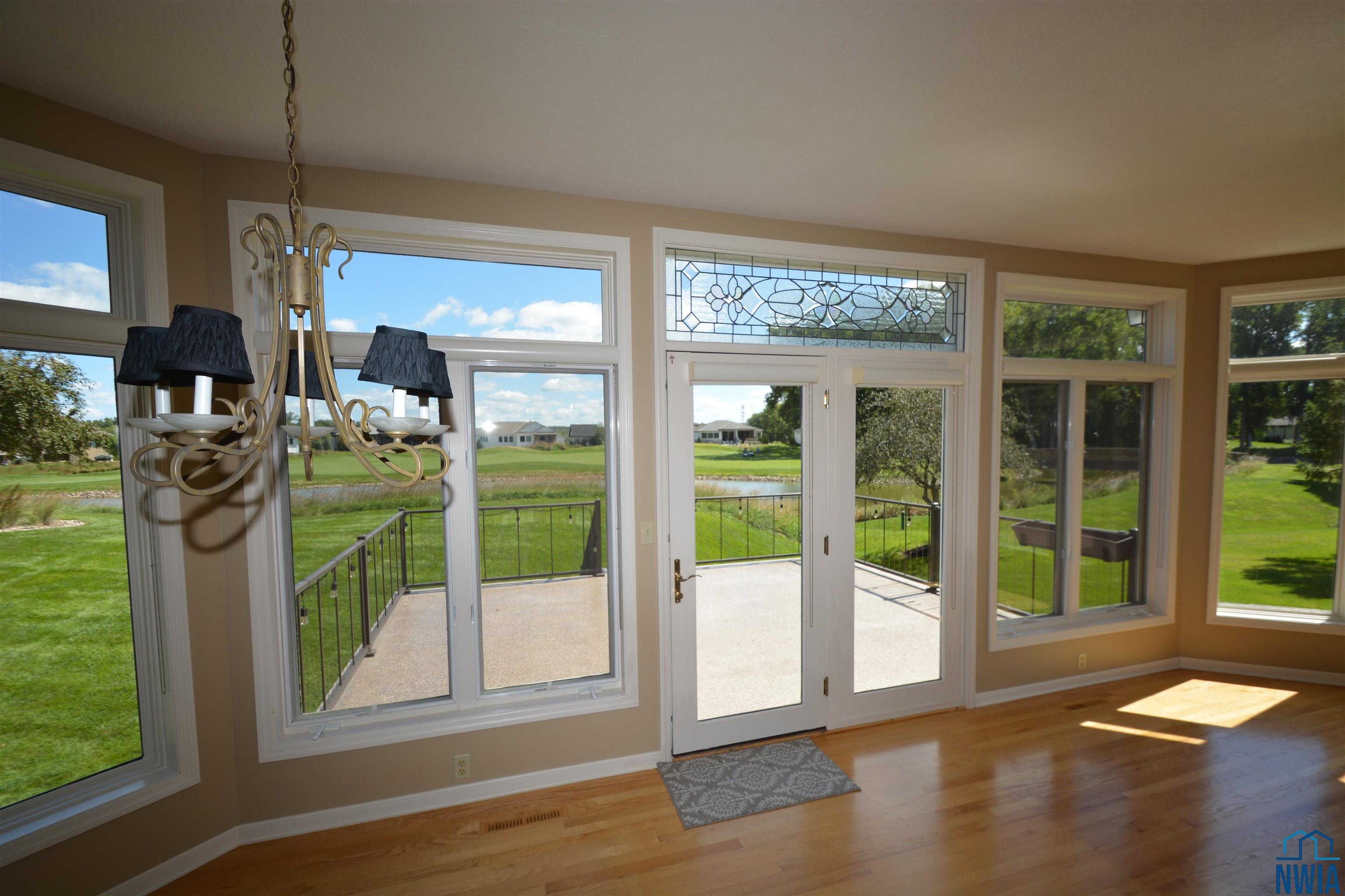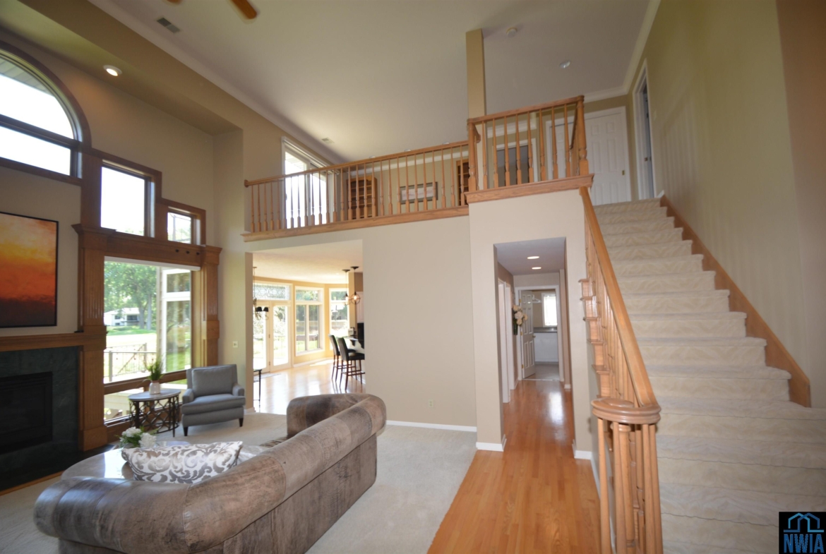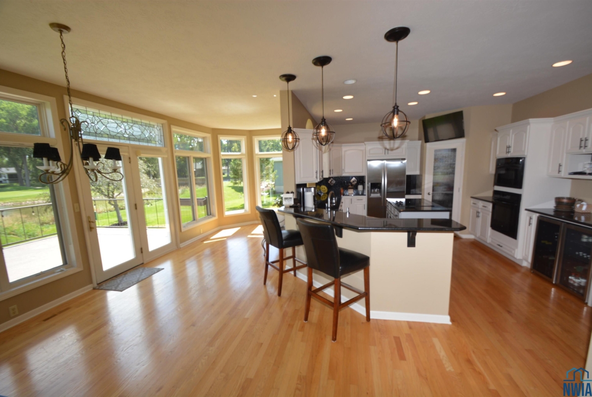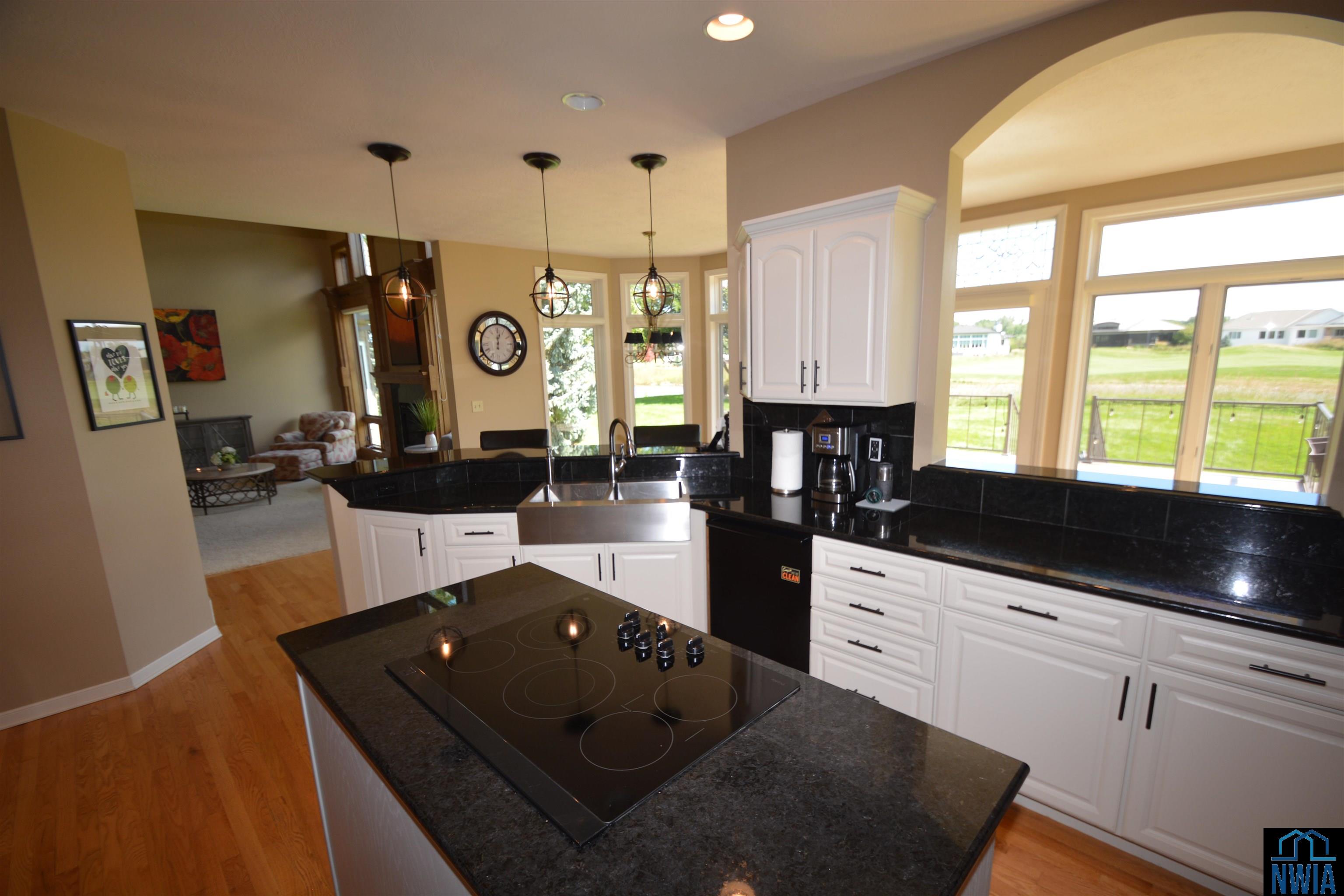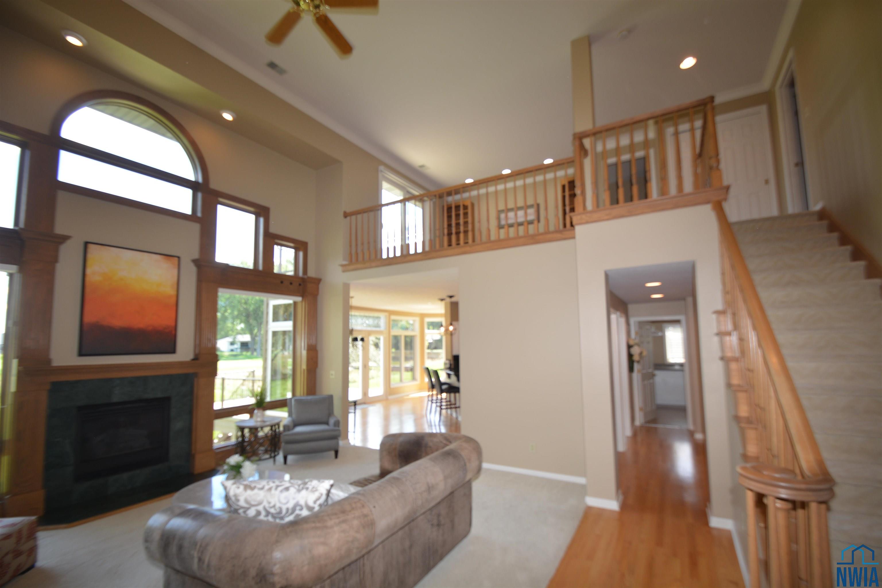 Stunning Golf Course Home with Panoramic Views. Enjoy sweeping views of the Dakota Dunes Golf Course, pond, bridge, and #5 green from this exceptional home on a private 1/3-acre lot. The 2023 updates kitchen boasts a walk-in pantry, crown molding, granite counters, tile backsplash, center island. The sunroom features lead-glass accents, filling the space with character and natural light with patio door to the deck. Upstairs, two bedrooms share a Jack & Jill bath, just off the loft office with access to a sundeck overlooking the course and pond. The spacious basement family room offers a wet bar, crown molding, built-in entertainment center and rope lighting in the tray ceiling. Recent upgrades include concrete decks (2015), siding (2016), 50 yr roof (2018), master bath (2021), and kitchen updates (2023). Storage is abundant with a full lower-level storage area plus a bonus storage room above the garage.