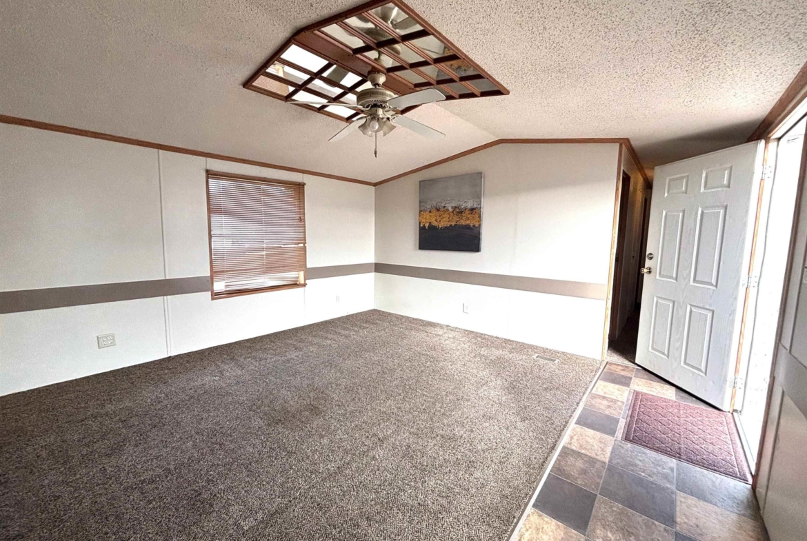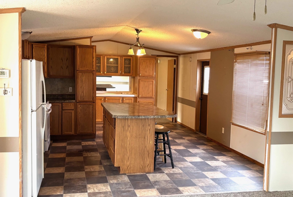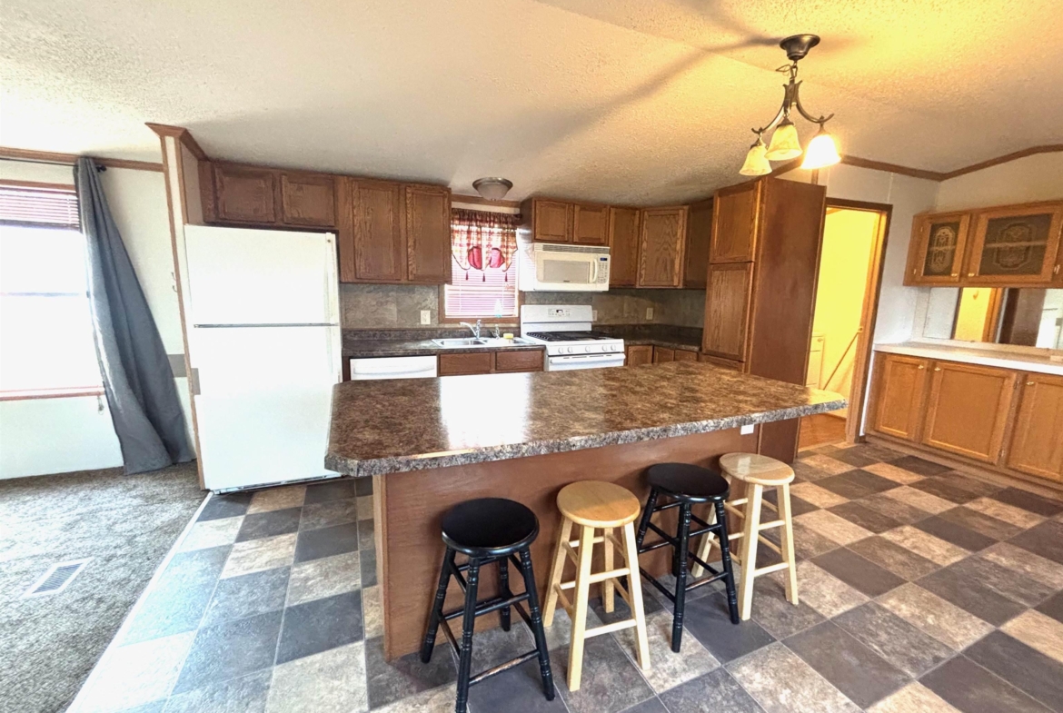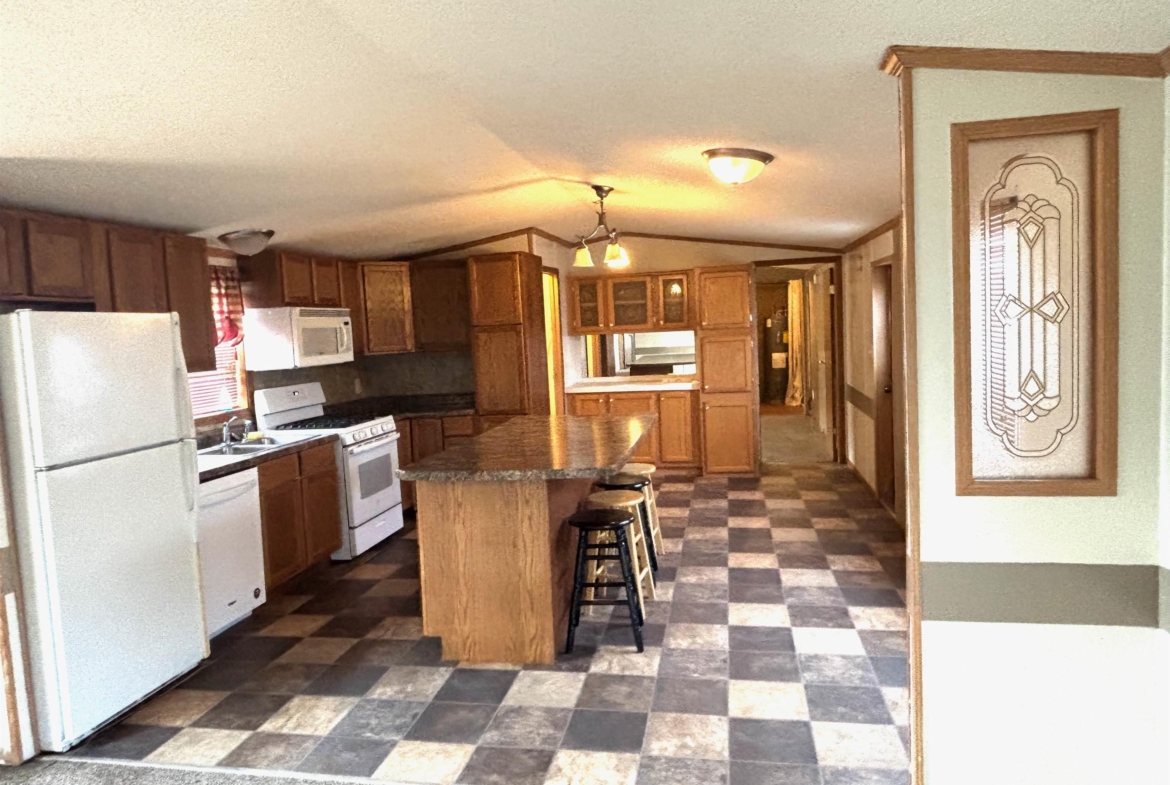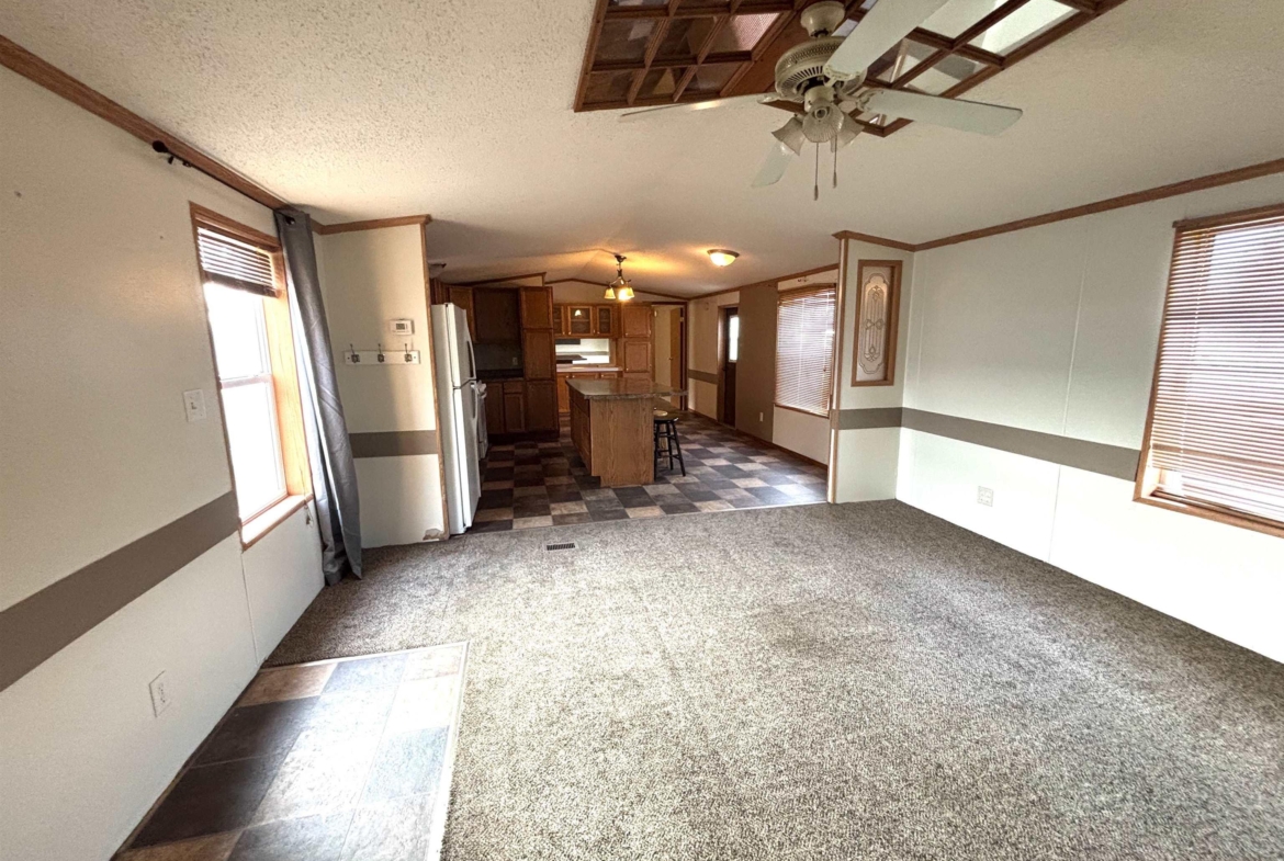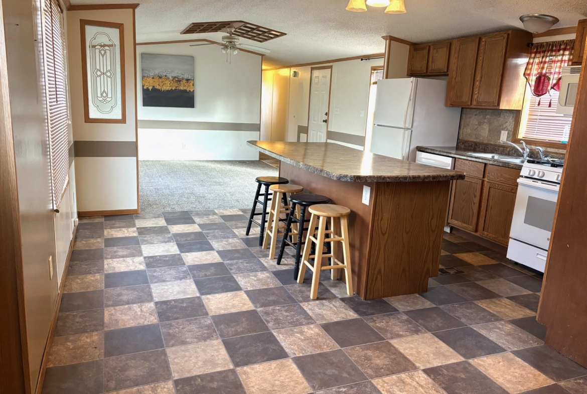 2000 Patriot Model PAT24330IN | 3 Bed | 2 Bath | 1,280 Sq Ft This well-maintained 2000 Patriot Model PAT24330IN manufactured home offers 1,280 square feet of thoughtfully designed living space, featuring 3 bedrooms and 2 full baths in a desirable split-bedroom layout that maximizes privacy and functionality. The spacious primary suite is situated on the west end of the home, separate from the two additional bedrooms and full bath on the east wing—an ideal arrangement for enhanced privacy. The primary bedroom is highlighted by a vaulted ceiling and ceiling fan with remote control, creating an open and comfortable retreat. The ensuite bath is designed for relaxation, featuring an oversized garden tub, separate shower, and distinctive glass block feature windows that provide abundant natural light while maintaining privacy. The kitchen is both functional and inviting, with all major appliances conveniently positioned along the south wall for efficiency. An expansive bar-height counter with built-in storage serves as a natural gathering space and includes four bar stools. This generous workspace allows for effortless entertaining—perfect for meal preparation while guests visit, or assisting with homework while dinner is underway. The upgraded gas range includes a bonus center griddle, and a microwave vent hood adds everyday convenience. The open-concept floor plan seamlessly connects the kitchen and living room, creating an airy and cohesive living space. Vaulted ceilings throughout enhance the sense of volume, while the living room is accented with a ceiling fan and distinctive mirrored tile detail above, adding character and visual appeal. Situated on a large lot, the property offers ample opportunity for outdoor living, recreation, or entertaining. Off-street parking accommodates two vehicles, with additional guest parking conveniently available along Duke Street. The home measures 16′ x 80′, totaling 1,280 square feet. Ideally located one block north of Cherry St.