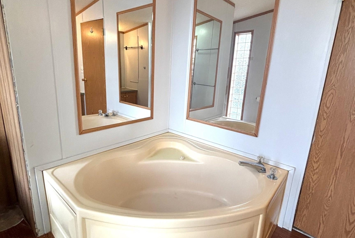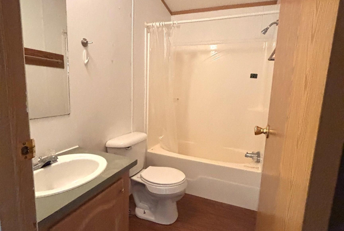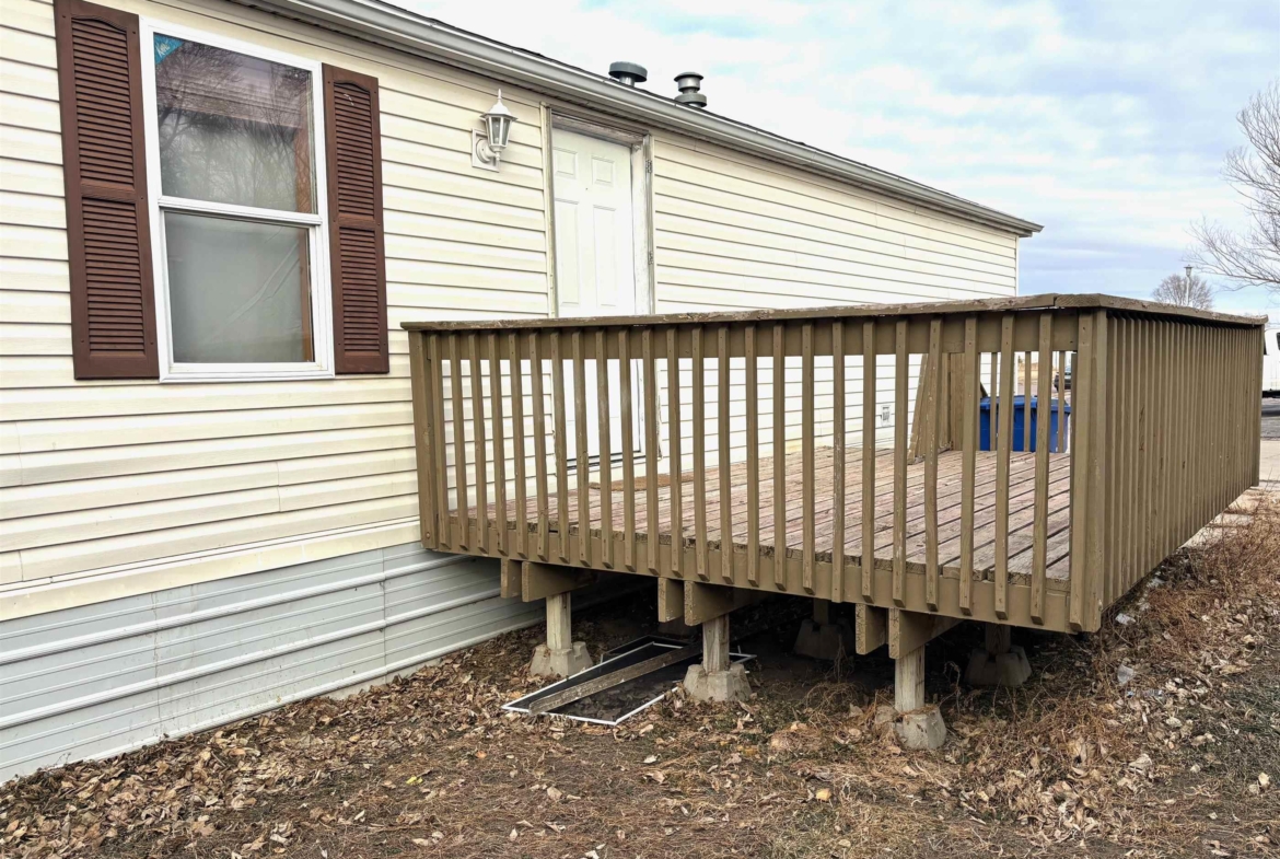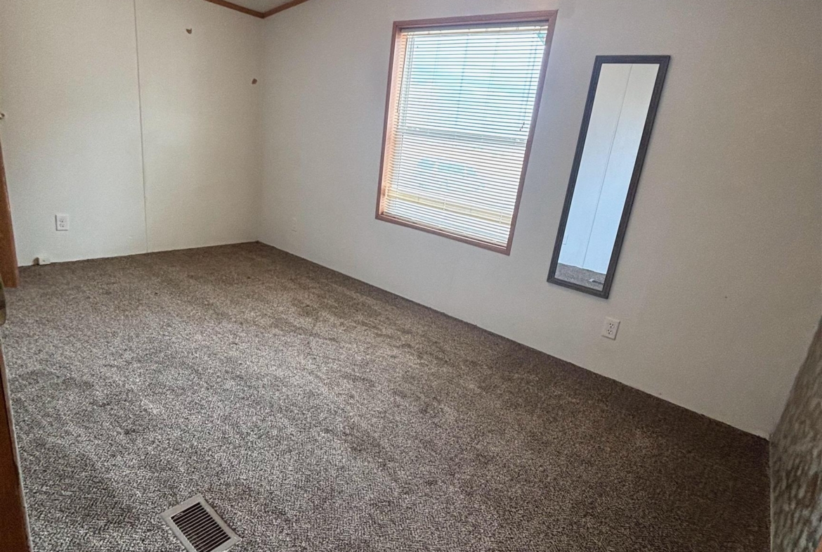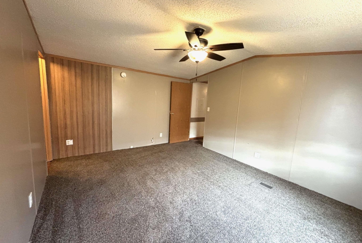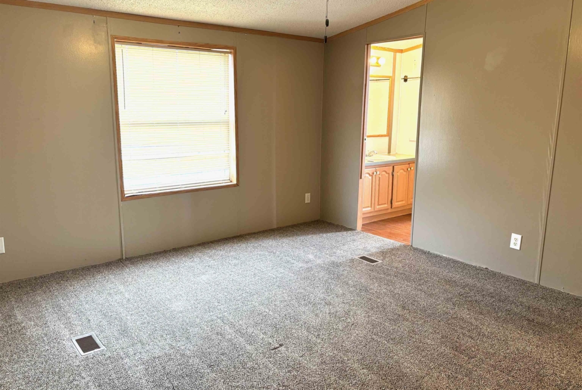 2000 Patriot Model PAT24330IN | 3 Bed | 2 Bath | 1,280 Sq Ft This well-maintained 2000 Patriot Model PAT24330IN manufactured home offers 1,280 square feet of thoughtfully designed living space, featuring 3 bedrooms and 2 full baths in a desirable split-bedroom layout that maximizes privacy and functionality. The spacious primary suite is situated on the west end of the home, separate from the two additional bedrooms and full bath on the east wing—an ideal arrangement for enhanced privacy. The primary bedroom is highlighted by a vaulted ceiling and ceiling fan with remote control, creating an open and comfortable retreat. The ensuite bath is designed for relaxation, featuring an oversized garden tub, separate shower, and distinctive glass block feature windows that provide abundant natural light while maintaining privacy. The kitchen is both functional and inviting, with all major appliances conveniently positioned along the south wall for efficiency. An expansive bar-height counter with built-in storage serves as a natural gathering space and includes four bar stools. This generous workspace allows for effortless entertaining—perfect for meal preparation while guests visit, or assisting with homework while dinner is underway. The upgraded gas range includes a bonus center griddle, and a microwave vent hood adds everyday convenience. The open-concept floor plan seamlessly connects the kitchen and living room, creating an airy and cohesive living space. Vaulted ceilings throughout enhance the sense of volume, while the living room is accented with a ceiling fan and distinctive mirrored tile detail above, adding character and visual appeal. Situated on a large lot, the property offers ample opportunity for outdoor living, recreation, or entertaining. Off-street parking accommodates two vehicles, with additional guest parking conveniently available along Duke Street. The home measures 16′ x 80′, totaling 1,280 square feet. Ideally located one block north of Cherry St.