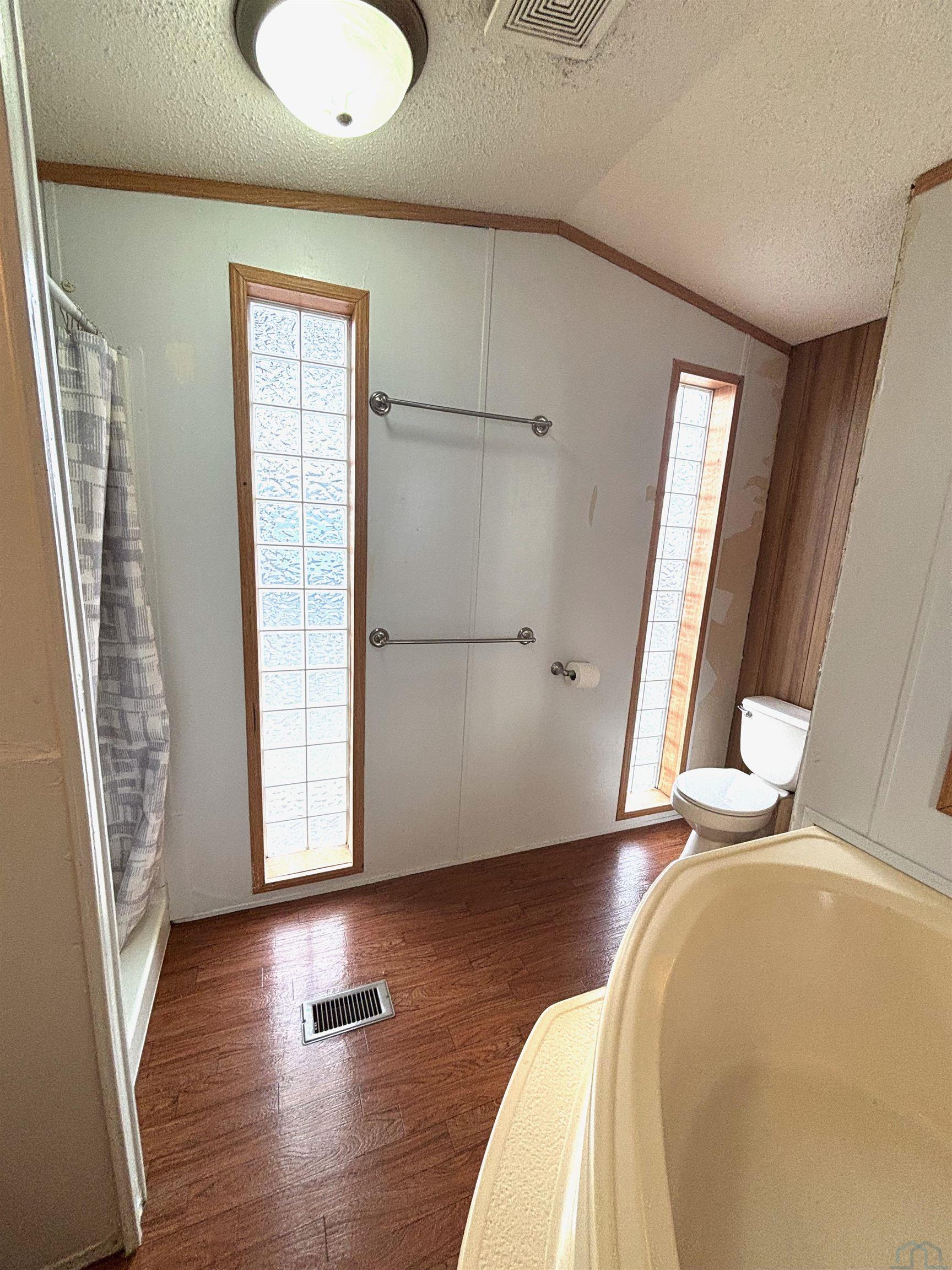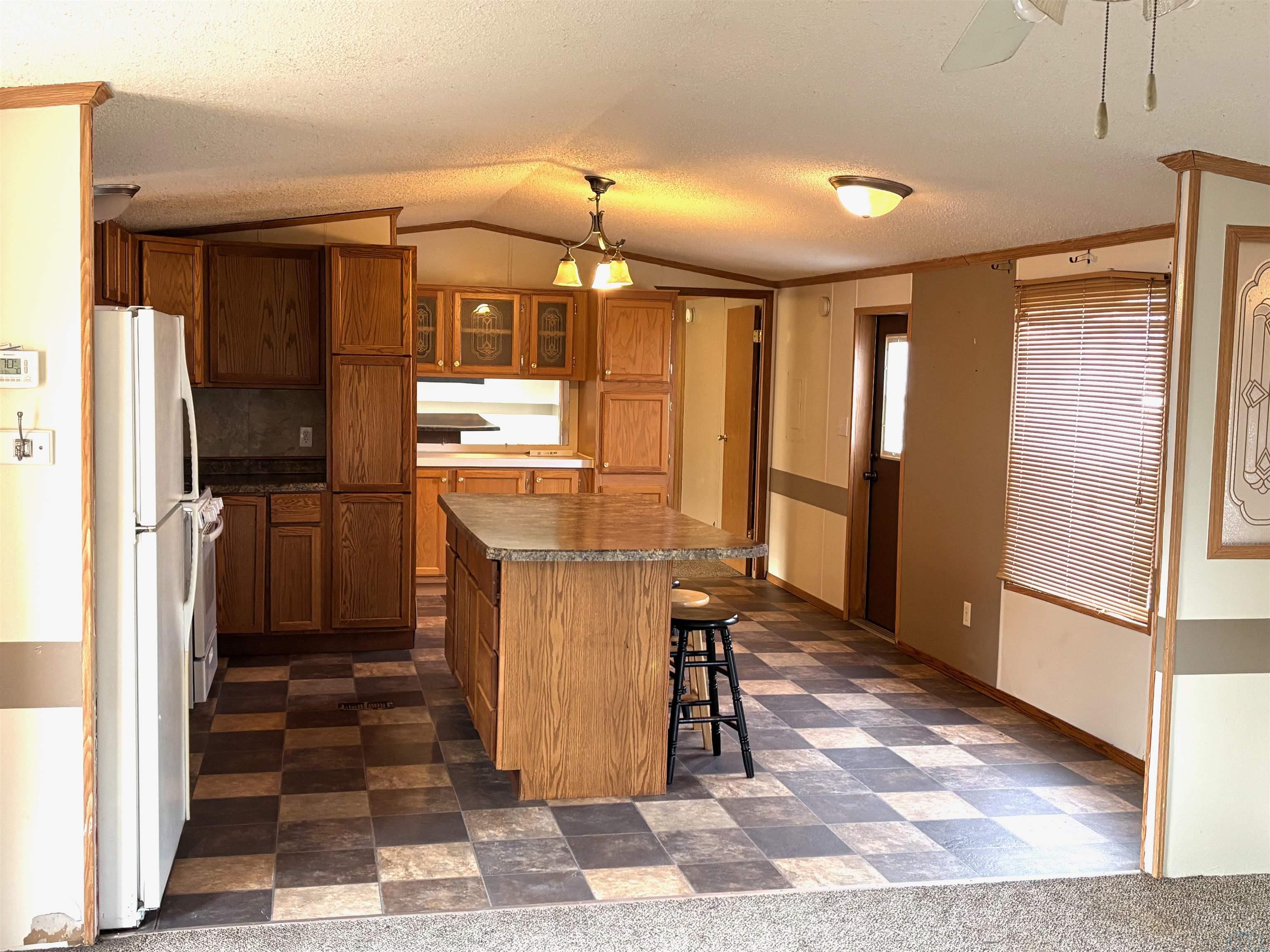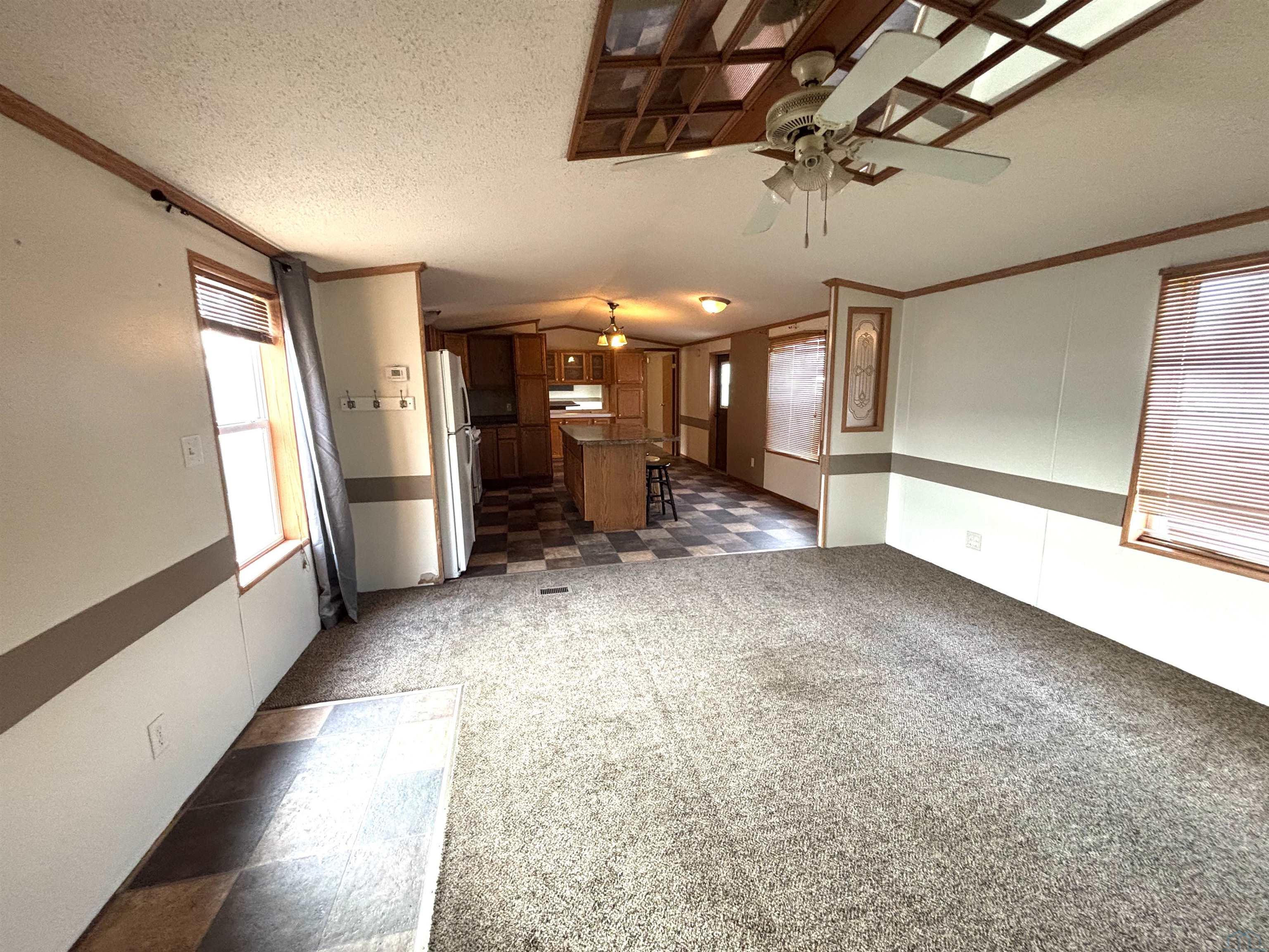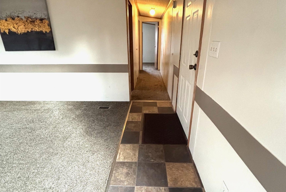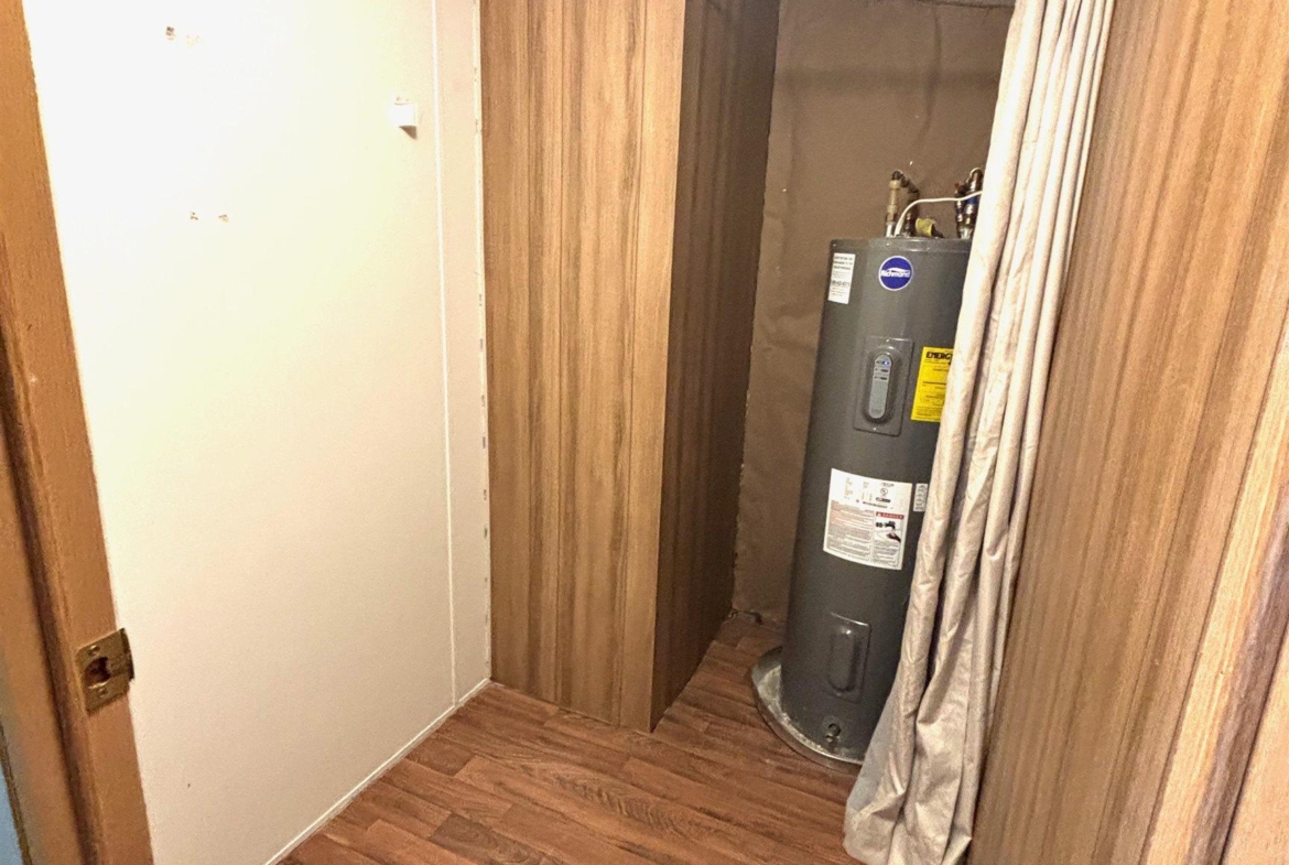 2000 Patriot Model PAT24330IN | 3 Bed | 2 Bath | 1,280 Sq Ft This well-maintained 2000 Patriot Model PAT24330IN manufactured home offers 1,280 square feet of thoughtfully designed living space, featuring 3 bedrooms and 2 full baths in a desirable split-bedroom layout that maximizes privacy and functionality. The spacious primary suite is situated on the west end of the home, separate from the two additional bedrooms and full bath on the east wing—an ideal arrangement for enhanced privacy. The primary bedroom is highlighted by a vaulted ceiling and ceiling fan with remote control, creating an open and comfortable retreat. The ensuite bath is designed for relaxation, featuring an oversized garden tub, separate shower, and distinctive glass block feature windows that provide abundant natural light while maintaining privacy. The kitchen is both functional and inviting, with all major appliances conveniently positioned along the south wall for efficiency. An expansive bar-height counter with built-in storage serves as a natural gathering space and includes four bar stools. This generous workspace allows for effortless entertaining—perfect for meal preparation while guests visit, or assisting with homework while dinner is underway. The upgraded gas range includes a bonus center griddle, and a microwave vent hood adds everyday convenience. The open-concept floor plan seamlessly connects the kitchen and living room, creating an airy and cohesive living space. Vaulted ceilings throughout enhance the sense of volume, while the living room is accented with a ceiling fan and distinctive mirrored tile detail above, adding character and visual appeal. Situated on a large lot, the property offers ample opportunity for outdoor living, recreation, or entertaining. Off-street parking accommodates two vehicles, with additional guest parking conveniently available along Duke Street. The home measures 16′ x 80′, totaling 1,280 square feet. Ideally located one block north of Cherry St.
