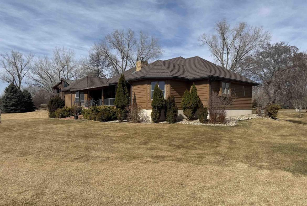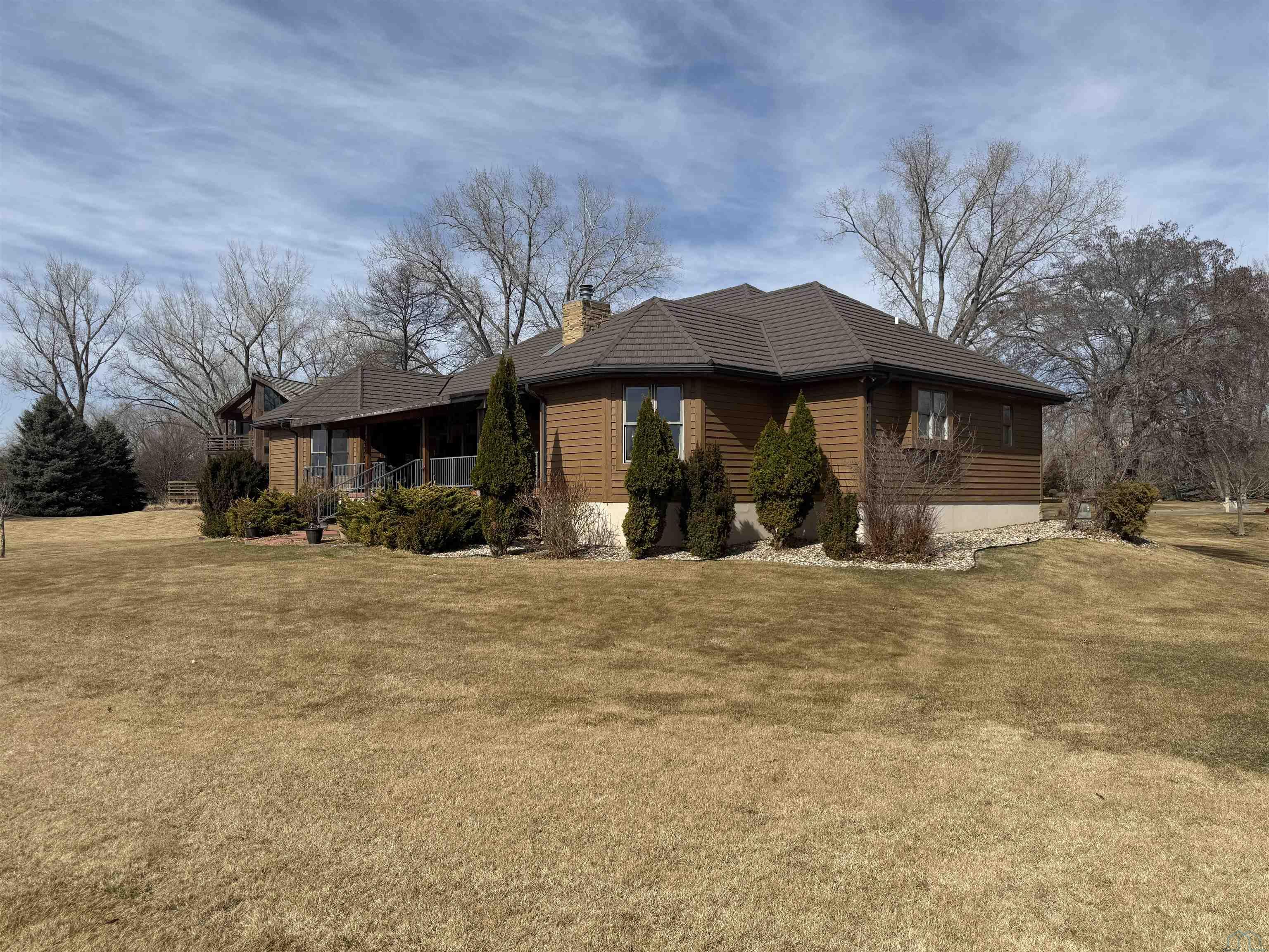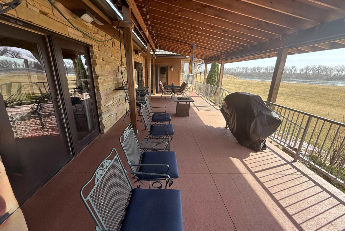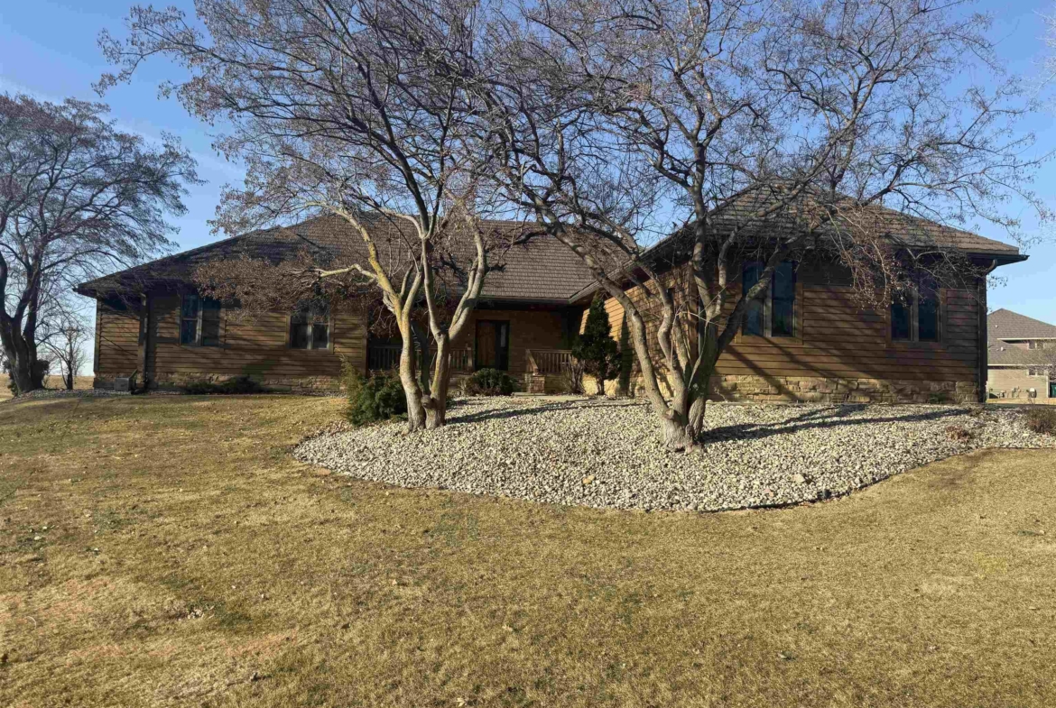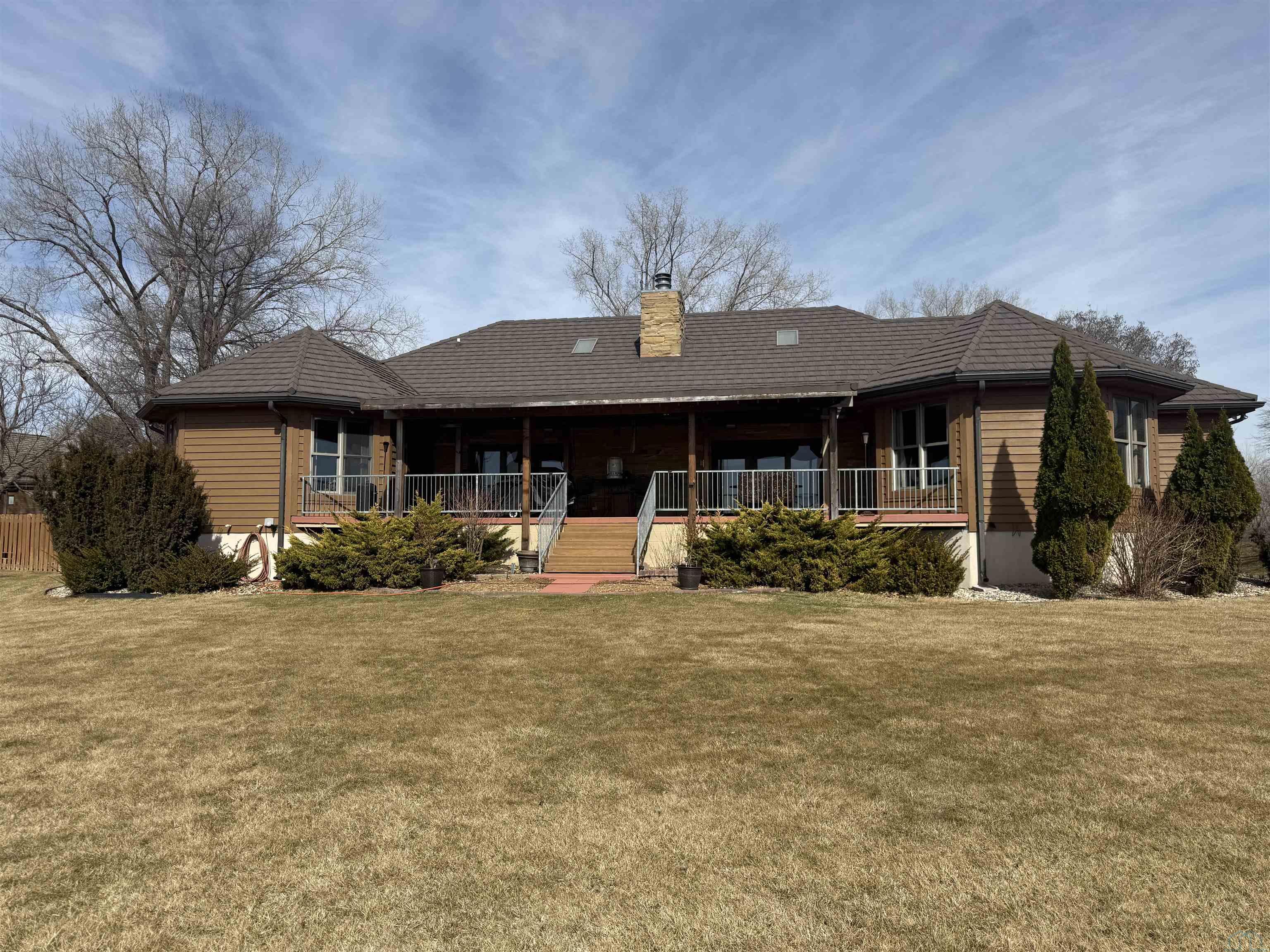 Nestled at the culmination of a secluded cul de sac and offering commanding vistas of the iconic Missouri river, this expansive four bedroom four bath ranch is an oasis from the grind of everyday living. The great room, kitchen, family room and primary suite all offer access to the sprawling concrete covered deck with stunning views of the river. Upon entry, the home welcomes with a grandeur, the focal point being a magnificent double sided stone fireplace delineating the kitchen and great room and sets the perfect ambiance for cozy evenings with loved ones. The culinary domain impresses with hardwood flooring, granite counter tops, tile backsplash and upgraded appliances. The great room and adjoining family room beckons for relaxation and boundless possibilities for entertainment. A sanctuary of repose, the primary suite boasts a spa like bath and generous walk in closet. Two of the remaining three bedrooms on the main are offering comfort and convenience with their own baths and walk in closets. Large main floor laundry has utility sink and lots of cabinets and counter space. The lower level is partially finished with interlocking matted floor squares. A protected 45 foot shooting range is ideal for an archery or gun enthusiast. In addition, the lower level has three large flexible areas, a wine room and plenty of closets and storage. Oversized, attached three car garage is heated and floor was just freshly painted. Large storage shed and fenced area on side of house is ideal for pets or a myriad of other uses. This almost one acre lot has in ground sprinkler system. Roof was replaced in 2017 with lifetime steel shake shingles. Cedar siding was freshly re-stained last fall. New gutter helmets were also installed at that time. Make this well built expansive ranch yours!