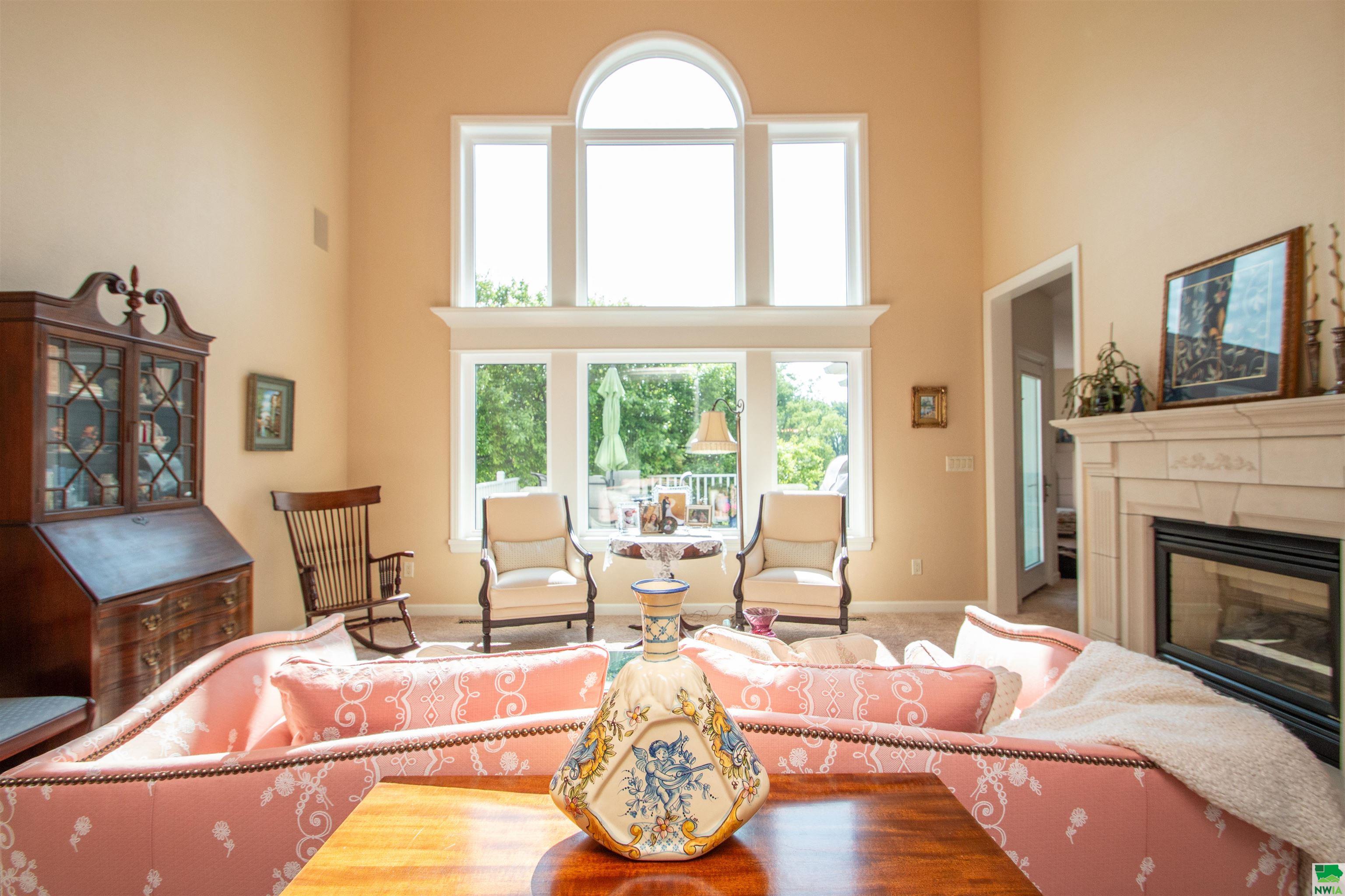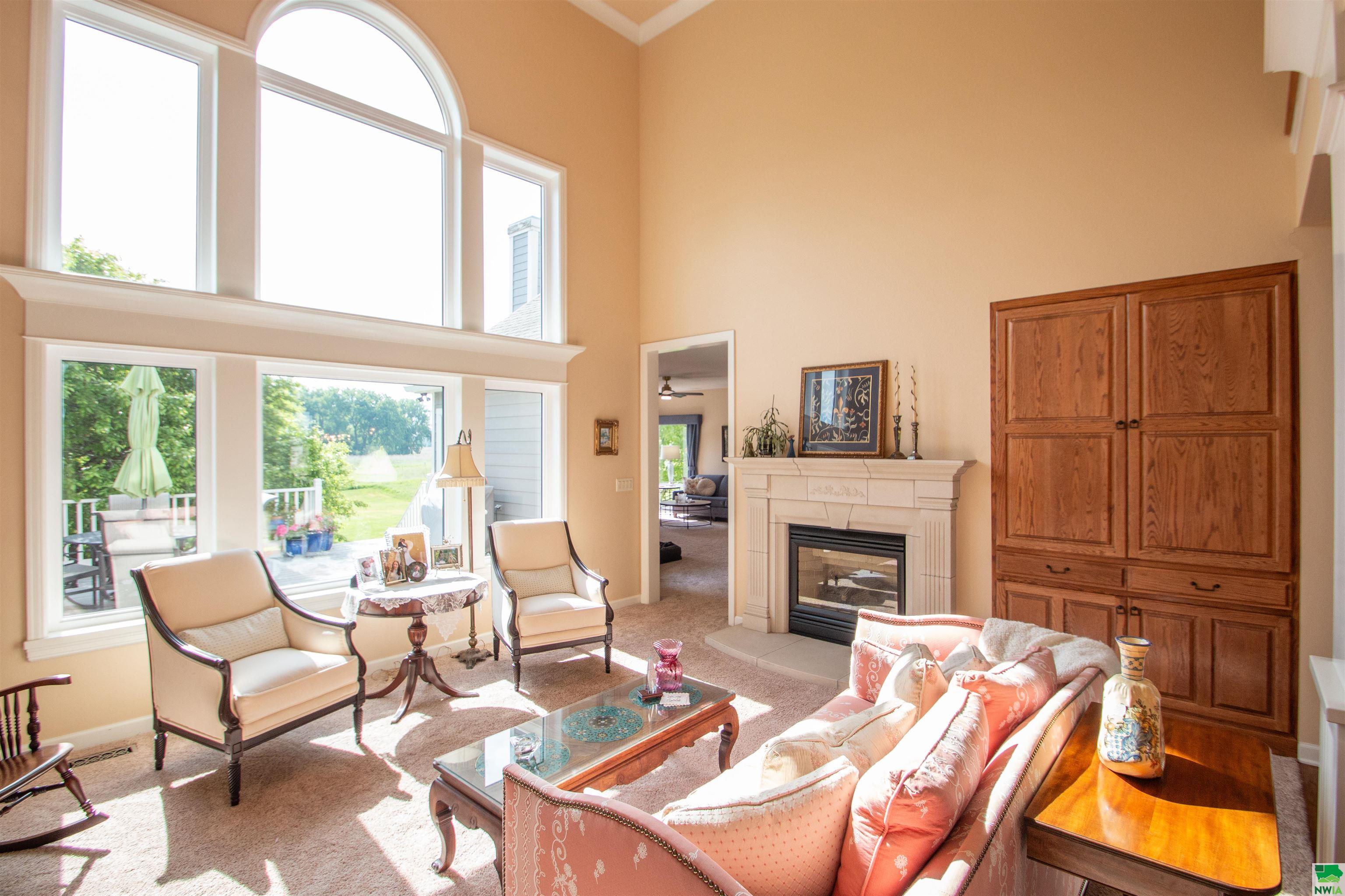 Living | Main | 14 x 16 | 18 ft ceiling, carpet, gas FP, 2 story windows |